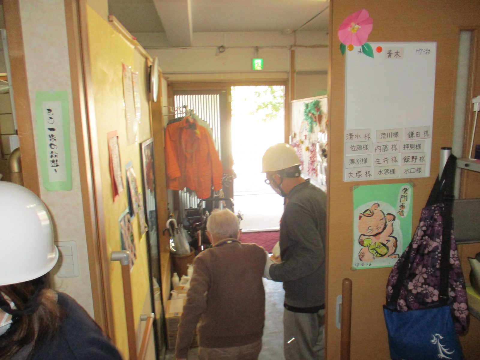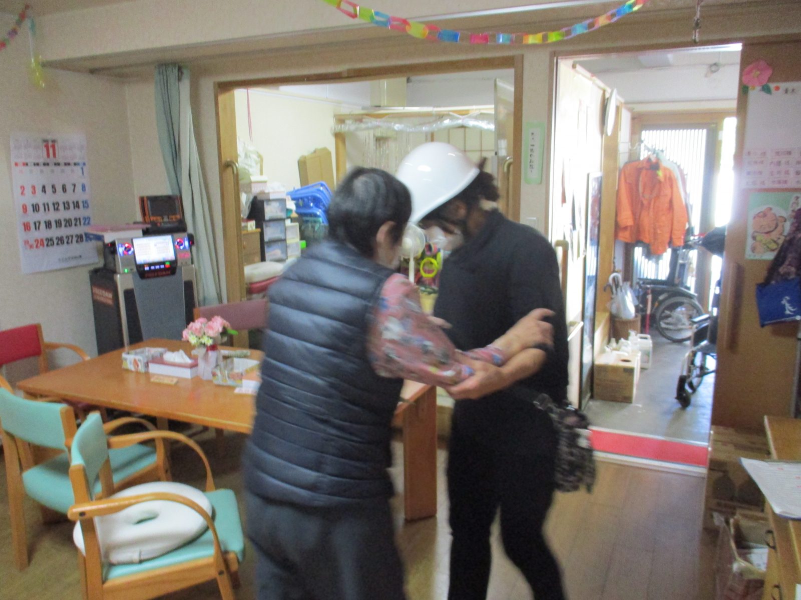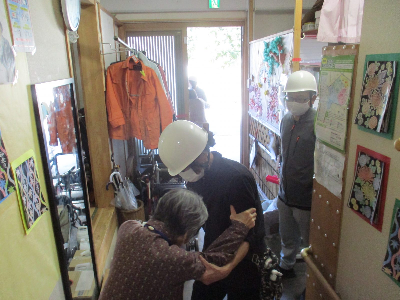 ご利用者様の安全確認後、スタッフがヘルメット着用して。余震に備えて布団など用意しています。